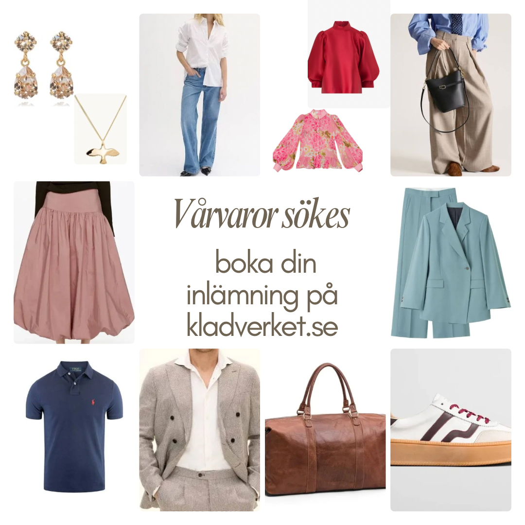 Vi tar emot dam, herrkläder XS-XXL och ungdomskläder från 160 cl, skor, väskor, smycken och accessoarer.